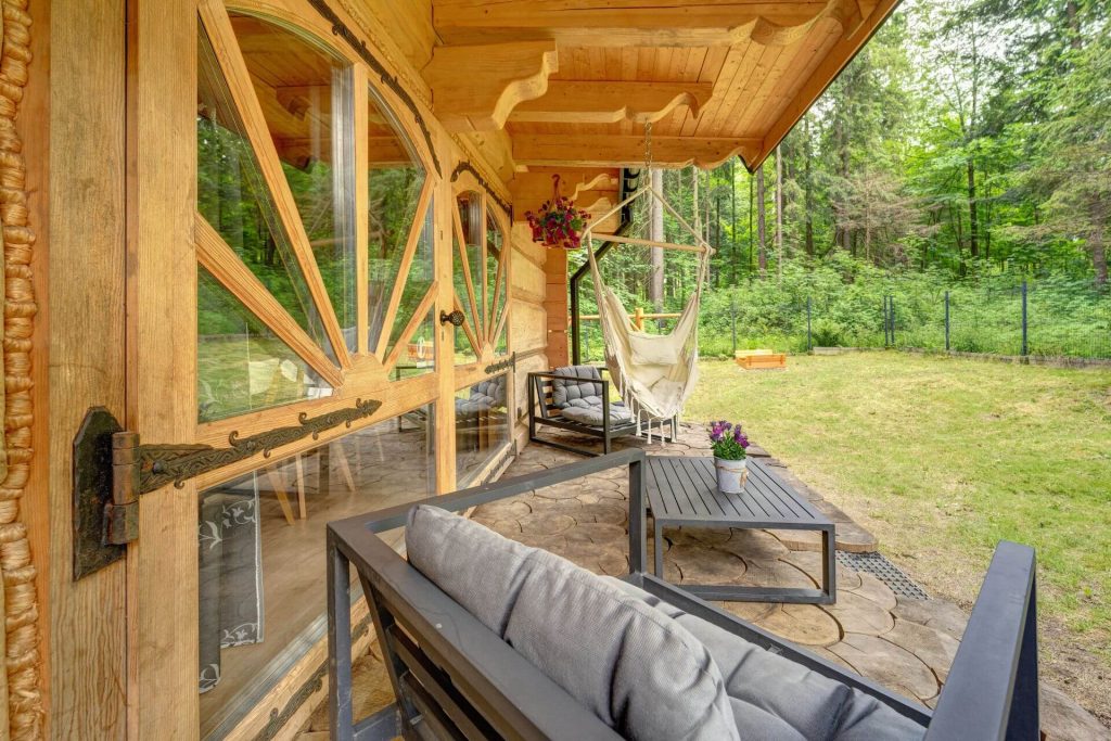 - Salon z bezpośrednim wyjściem na zadaszony taras przed domkiem, na którym znajduje się jacuzzi.